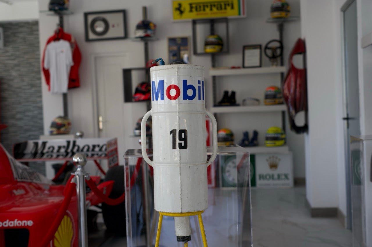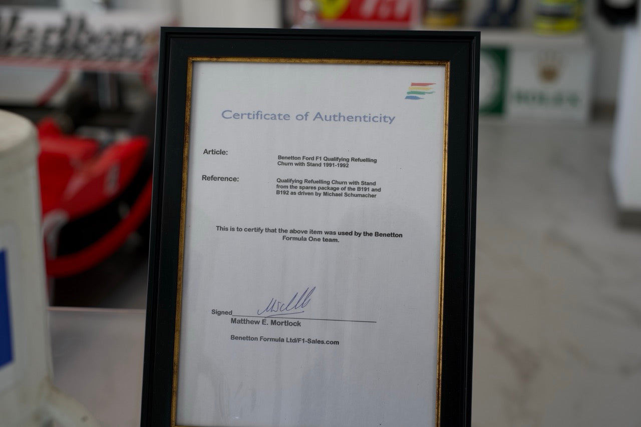 This extra rare piece is a Benetton Ford F1 qualifying refuelling churn with stand used during during the 1991 and 1992 season.